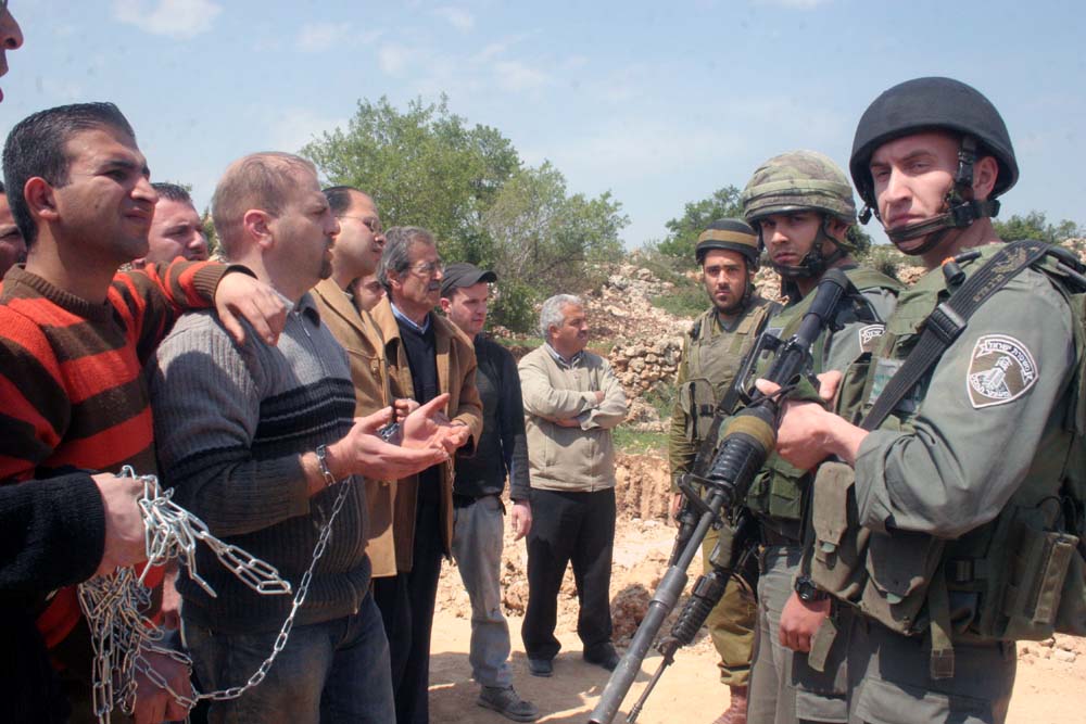 What happened then was truly a sign of absolute despair and powerlessness by the Israeli army. Every attempt to provoke us to use violence against them failed (pointing their machine guns at us, threatening to use shock grenades, and using foul language and threatening remarks), every attempt to scare us failed; our commitment was to send a message to them and to the world that the power of Understanding how empowered we had become, realizing that their weapons and threats had become futile, and wanting to destroy what we had achieved and scare us from continuing our future protests, the Israeli soldiers were ordered by their commanders to physically attack, beat, and arrest us. Many were physically hurt and one was arrested, but even in that, we never showed any sign of violence. We only shouted “peace and nonviolence.”