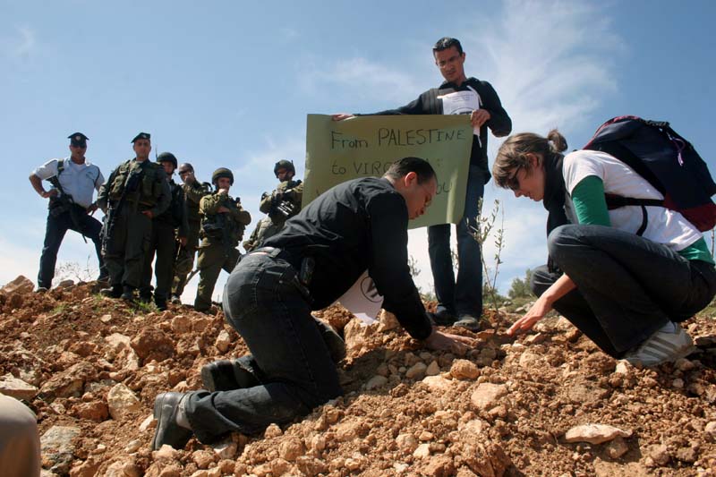 Every Friday, Palestinians, internationals, and Israeli nonviolent activists gather in the Southern villages of Bethlehem to protest against the building of the Apartheid Wall that will eventually destroy the livelihood of these villages. This Friday, the protest began with a silent procession by the group of about fifty participants. We carried banners and leaflets with the Virginia Tech logo and statements supporting them in this time of pain. Thirty two olive trees were also carried in the procession to remember each person killed in the massacre. The olive tree is a global symbol of peace and hope.